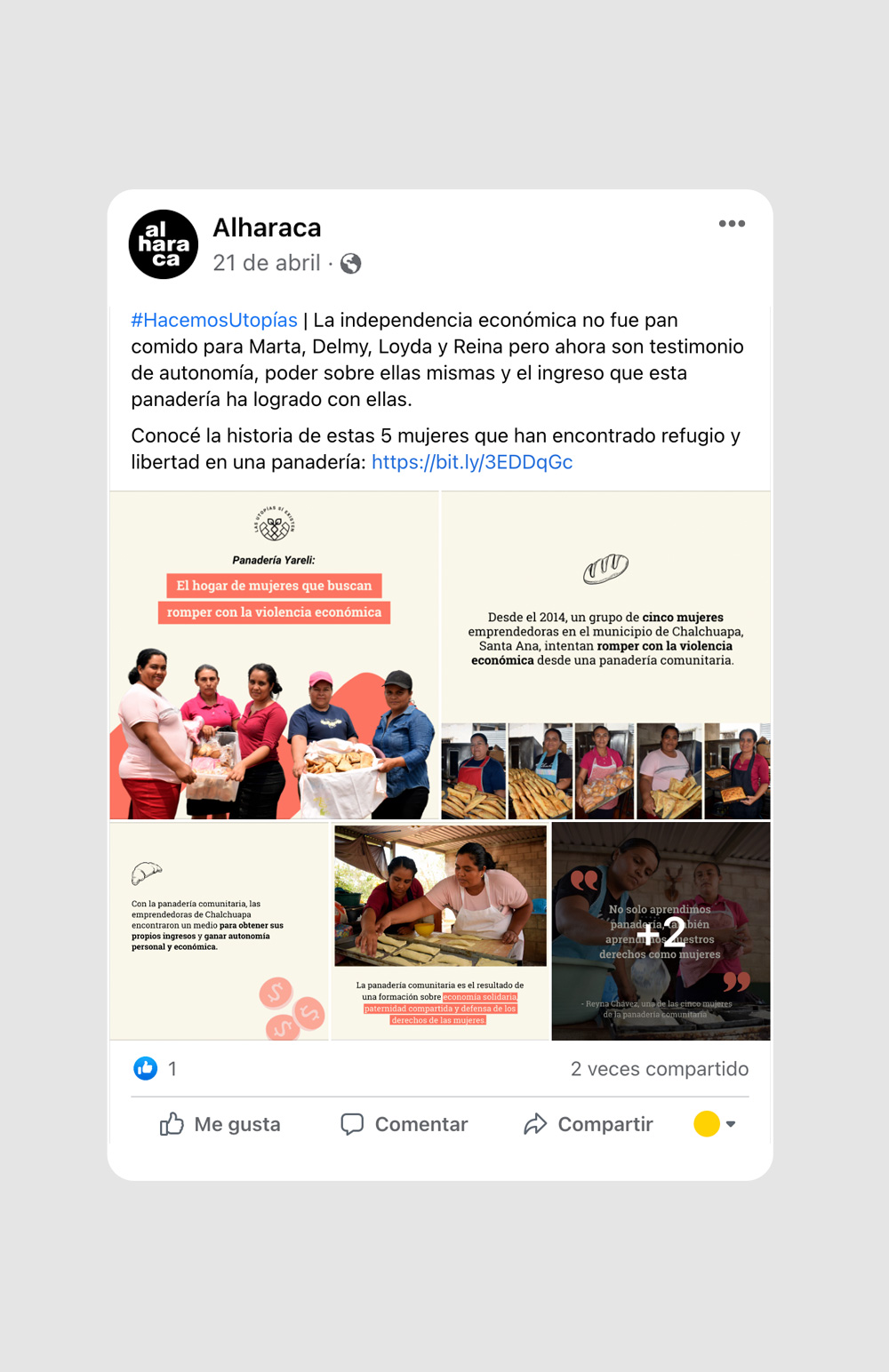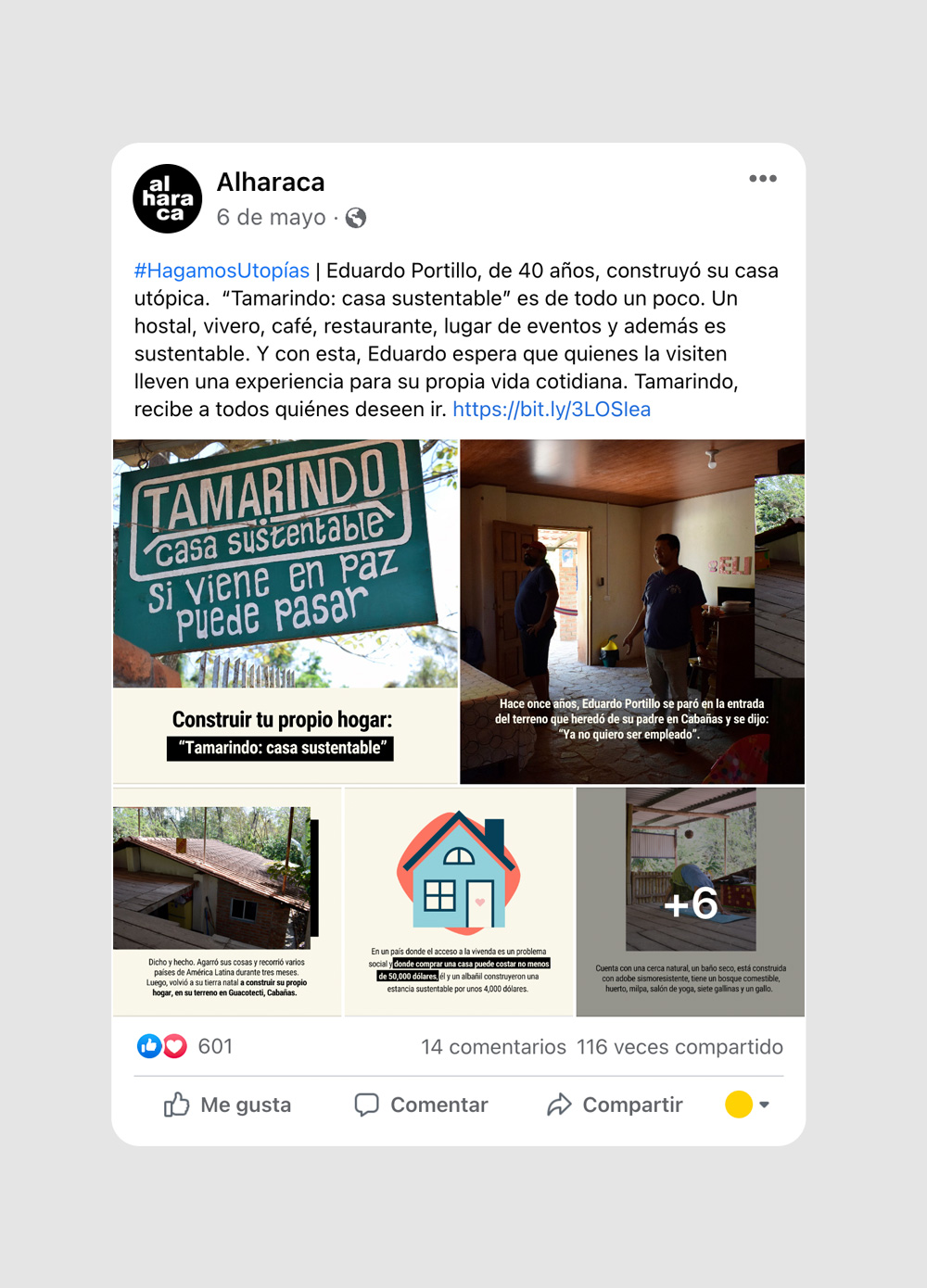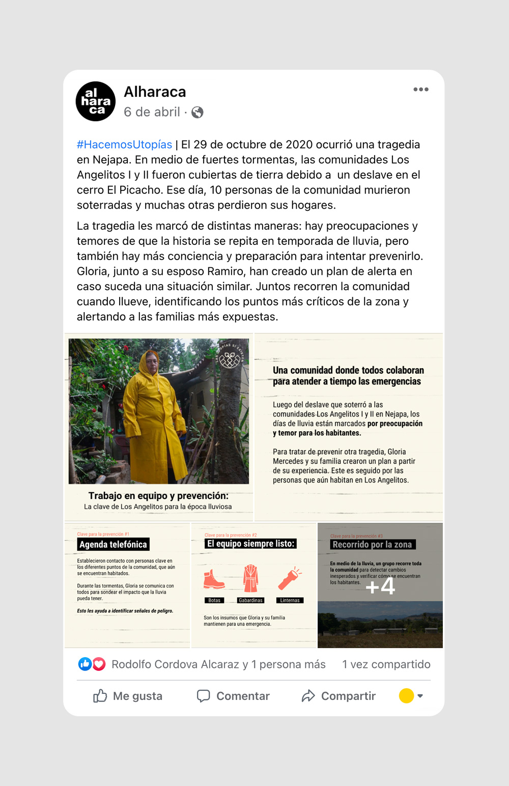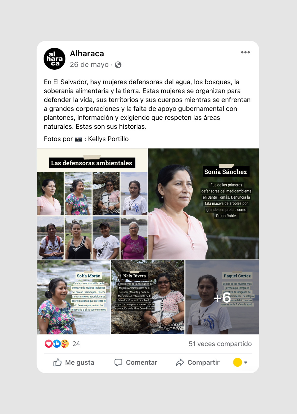 Alharaca produced a broad range of content to work across different platforms, with a focus on Facebook as the most used platform in the country. They told stories like Los Angelitos, who in the absence of the state showed agency to organize themselves, environmentalists or simply a Taekwondo school teaching self-defense. They experimented with different formats and found videos to generate with more reach and engagement. Carousels mixing images, design, advice and generally deepening storytelling also worked well.
